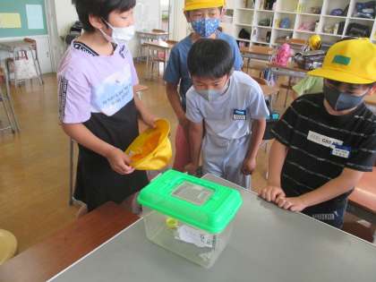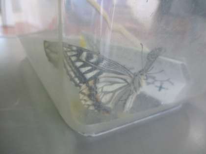 観察していたアゲハチョウがさなぎから成虫になりました。子供たちは朝から大歓声を上げて喜びました。飛べるようになったチョウには、虫かごは狭くなったので、外へ放つと、校舎上まで飛び立つ様子が見られ、感動していました。