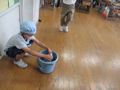 萩浦小学校では、毎週金曜日の床掃除は水拭きをしています。だから、普段の掃除とは違う音が聞こえてくるのです。3年教室では、固く絞ったぞうきんで教室や廊下の床を丁寧に拭いています。水拭きを終えたぞうきんは、いつも以上に真っ黒です。掃除を頑張った証拠ですね。