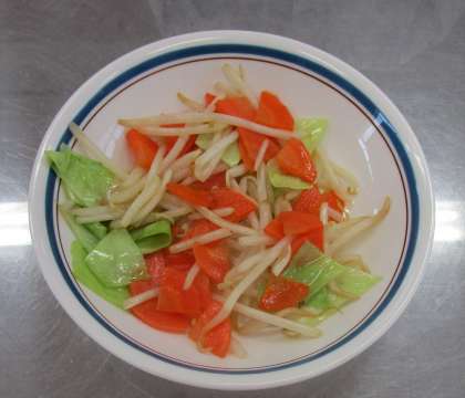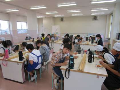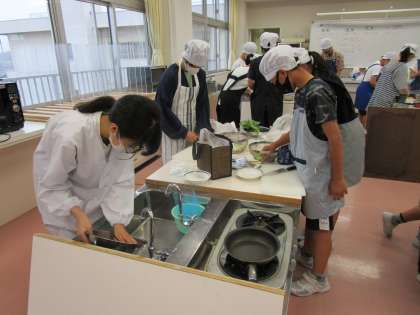 一人で野菜いためを作りました。「うまくいためることができた」「もう少しいためる時間をかければよかった」「具材の切り方といためる時間で食べ応えが変わることを知った」など、振り返っていました。休日や夏休みにぜひ家族のために作ってほしいと思います。