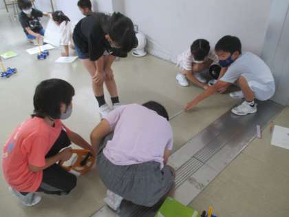 子供たちはウインドカーで遊び、当たる風が強くなると「遠くまで進む」「速く走る」と感じました。今日は、それが本当なのか実験方法を考え、実験に取り組みました。