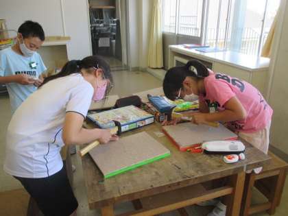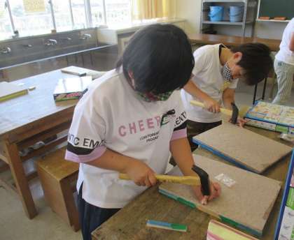 図工室では、「トントントン」と金槌で釘を打つ音が響いています。周りの補強をしたり、発射台や障害物を取り付けています。完成が楽しみです。