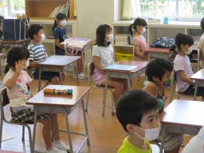 感染症予防対策のため、子供たちは放送室から聞こえる校長先生のお話や代表児童の話を静かに聞いていました。