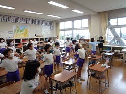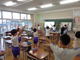 雨天だったため、きらりタイムは校舎内でラジオ体操を行いました。学校でのラジオ体操は久しぶりでしたが、楽しみながら元気よく活動していました。「ラジオ体操第2」を覚えている子もおり、感心しました。