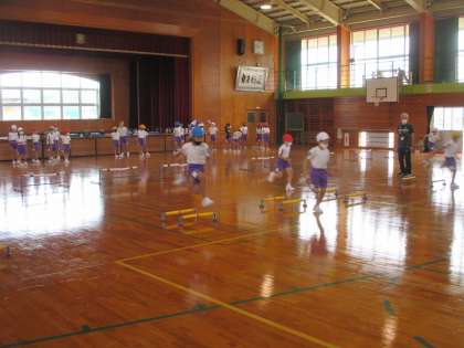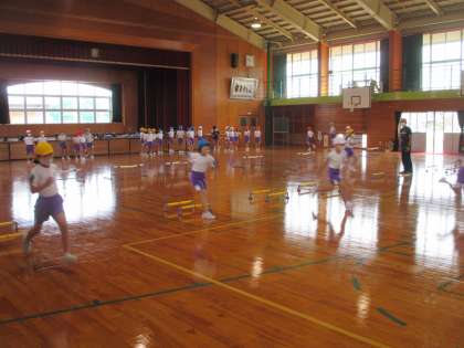 体育科の学習で、走り幅跳びと小型ハードル走の学習が始まりました。今日は、障害物を飛び越える感覚をつかんだり、片足で踏み切り両足で着地したりする練習をしました。