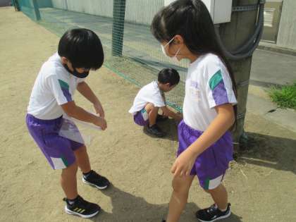 生活科の学習で、虫を育てています。子供たちは、休み時間にも虫を探したり、えさをとったりと、生きものに親しんでいます。