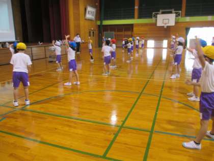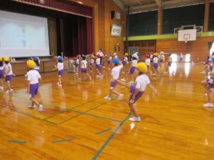 体育の学習で、リズム遊びをしています。今日は、全員で曲に合わせてダンスをしました。体全体を使ってみんなで楽しく踊り、たくさんの笑顔が見られました。