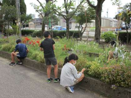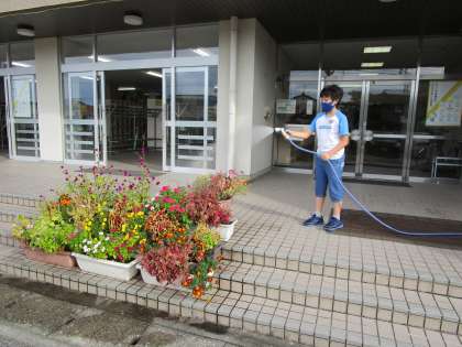吹く風が気持ちよい朝です。さわやかタイムに飼育栽培委員会の子供たちが玄関前のプランターの水やりや花壇の除草をしてくれました。