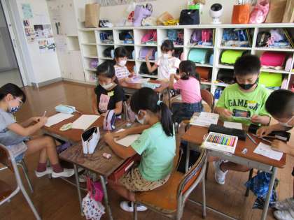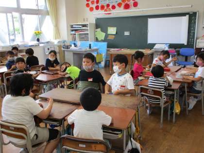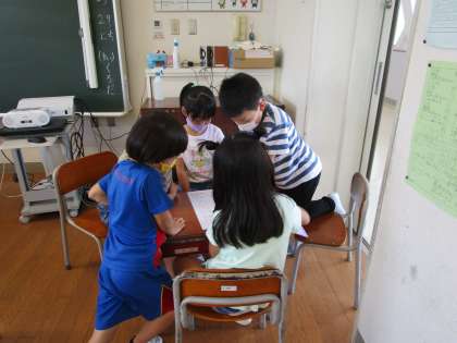 1、2年生は「係活動」を進めていました。学級のためにどんな活動ができるのか、グループで相談しています。