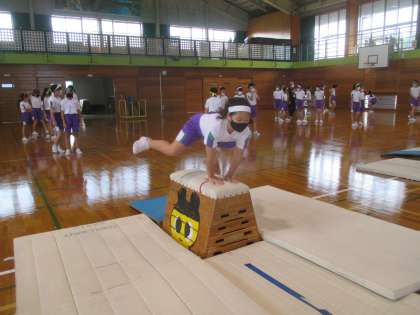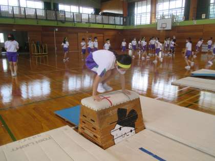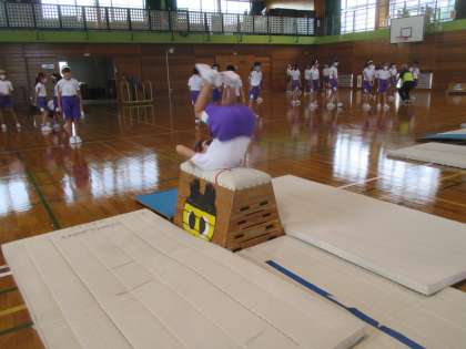来週の発表会に向けて、開脚跳びや抱え込み跳び、台上前転の練習をしています。手の着き方や着地の仕方等に気を付けて上手になってきました。