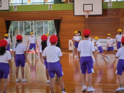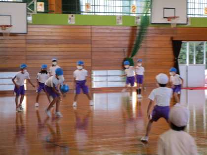 3年生と2年生が体育館でドッジボールをしていました。3年生が2年生に楽しんでもらおうと計画した交流活動です。