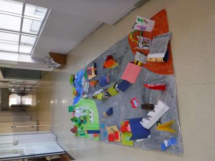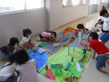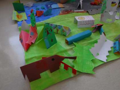 図画工作科「おってたてたら」の学習では、みんなでつくったまちに自分の作品を並べて、「1の2タウン」ができあがりました。