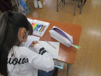 9月に行ったイラストコンテストの続きが行われました。テーマは前回と同様の「秋」でした。子供たちは、前回のものに色や模様を加えて工夫したり、新しい作品を作ったりして、時間いっぱい楽しみました。今日できあがった作品をみんなで鑑賞することが楽しみです。