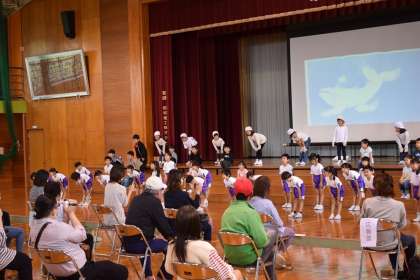 本番は、緊張感をもちながらも、これまで練習してきたことを精一杯出し、のびのびと劇をすることができました。本番後、話を聞いてみると、「大きな声でできてよかったよ」「歌うのも台詞を言うのも楽しかったよ」と、「くじらぐも」の世界を楽しみ、達成感を味わっている様子が窺えました。
