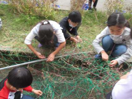 また、クラス全員で育てていたアサガオも、2階までつるが伸びていたので、みんなで力を合わせて綺麗にしました。