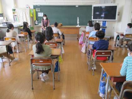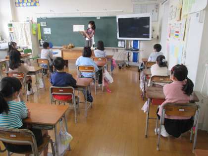朝のマイタイムの時間に、読み聞かせをしていただきました。子供たちは、話を夢中で聞いていました。昔話や詩、言葉遊びなど、様々な絵本を紹介していただきました。言葉遊びでは、みんなで声に出して、楽しみました。