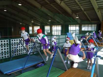 1年生は、鉄棒を使った運動遊びを続けています。