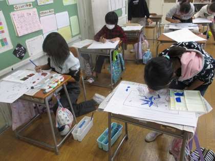 心に残っている出来事やそのときの気持ちを絵に表しています。そのときの思い出を語りながら、楽しく活動しています。どんな作品になるのか楽しみです。