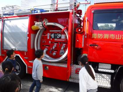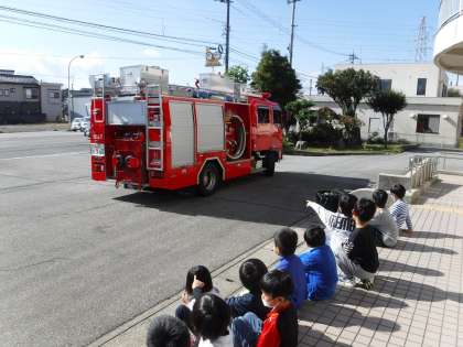 「長いホースが付いている。ここから水が出るのかな」「タイヤが僕の背の胸ぐらいの高さまであったよ」「スコップも付いている」「上にはしごがあるよ」と、消防車のつくりに興味をもって見ていました。