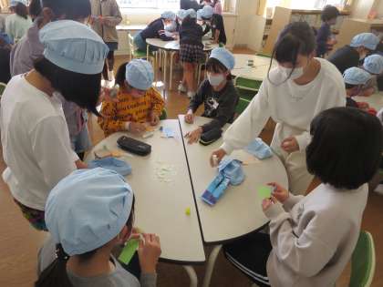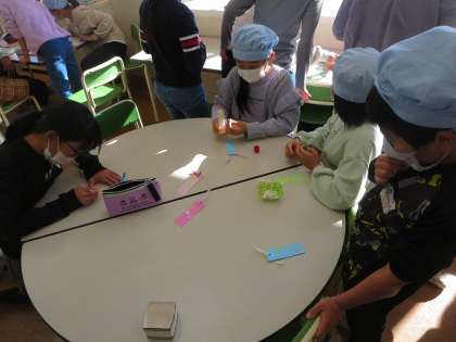 図書館司書の先生が考えてくださった本のしおり作成に、なかよしタイムの時間に参加しました。友達と楽しみながらオリジナルのしおりを作ることができました。