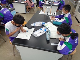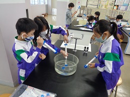 理科では、閉じ込められた空気や水に外から力を加えると体積や手応えはどうなるのか調べました。空気での実験結果と水での実験結果を比較して、それぞれの違いについて考えていました。