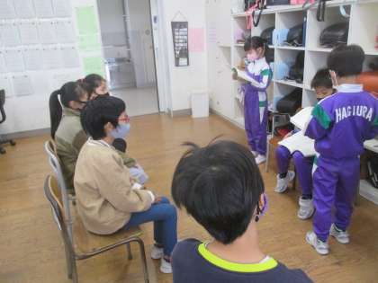 2年1組の音読発表を聞きました。2年生の国語科で習った「お手紙」の音読を聞いて、「なつかしいな。話を思い出した」「気持ちを込めて読んでいて上手だった」「動作をつけていたから分かりやすかった」などと感想を言っていました。また音読会を開いてほしいです。