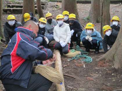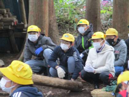 一番楽しみにしていた森小屋作りです。事前指導に学んだことを生かしてみんなで協力してがんばります!