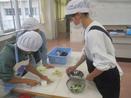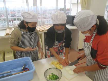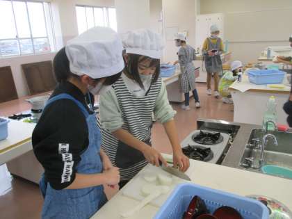 家庭科の調理実習で、味噌汁をつくりました。2回目の調理実習なので、前回よりも手際よく進めていました。「手を切らないように気を付けて」「味噌を沸騰させないようにした方がいいよ」「やけどしないように」などと優しく声をかけ合う姿が素敵でした。子供達は、にぼしで出汁をとった味噌汁を「本当においしい」と言って食べていました。