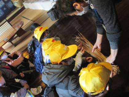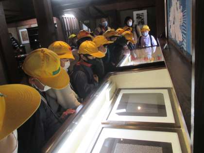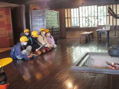 民俗民芸村では、子供たちが生まれるはるか前の昔の道具や建物を見学しました。いろりの様子や昔の農具や生活用品等に、どの子も興味津々でした。子供たちは熱心にメモを取ったり今の暮らしと比べたりして、理解を深めていました。