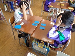 外国語活動では、アルファベットについて学習しています。今回は、アルファベットの小文字や発音になれるために、カルタ形式のゲームを行いました。ペアで楽しみながら、小文字の形の違いなどに気をつけて学んでいました。