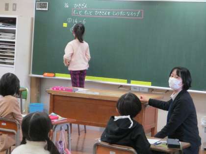 算数科の学習参観では、これまで学習してきた「ひきざん」の理解をさらに深める学習を行いました。計算の仕方をもう一度見直したり、計算カードを使って練習したりしながら、「ひきざん」に親しみました。