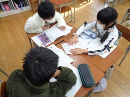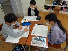 算数科では、四角形の特徴を調べ、特徴を生かした平行四辺形のかき方を考えました。自分で考えた平行四辺形のかき方を友達に説明し、正しく作図することができるのか話し合いました。