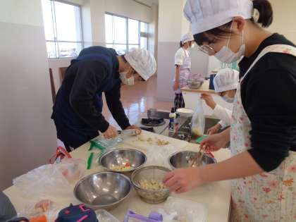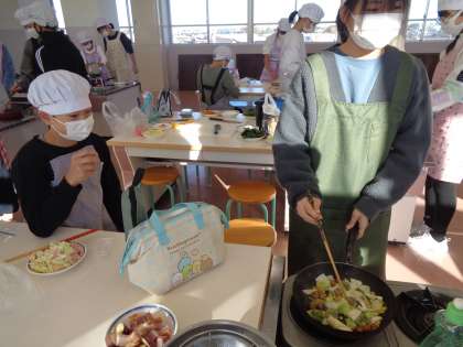 家庭科では、一日の献立を考える学習をしています。今日は、自分が立てた献立の中からおかずになる1品を調理しました。班の友達と声をかけ合いながら、おいしいおかずが出来上がりました。