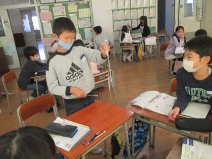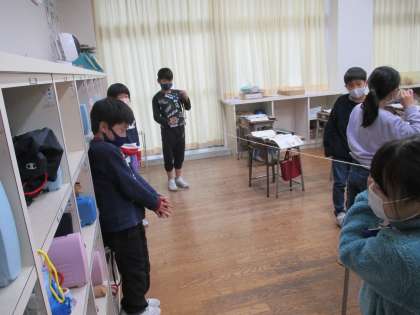 理科の学習では、音が伝わる様子について学習を進めています。今日は、トライアングルに付箋を付け、音を出したら付箋が震えているのかどうかや、糸につないで糸が震えるのかどうかについて実験を行いました。