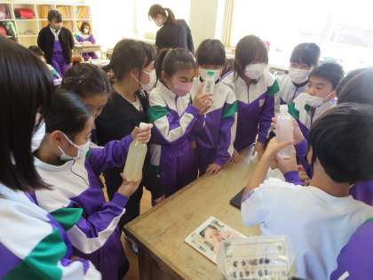 理科の学習で「ものの溶け方」の学習をします。今日は、今までに飲んだことのあるお茶やジュースを観察することで「何かが溶けている状態とはどんな状態なのか」考えました。「見た目で色が付いていると何かが溶けている気がする」「ポカリスエットは飲むと甘いから砂糖がとけているはずだ」「ラベルを見たら成分が分かるからそれが溶けているはずだ」など、自分の経験を基に考えて発言する子供の姿を見ることができました。