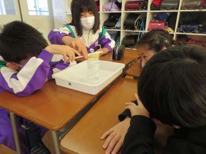 授業の最後に塩が水に溶け出していく様子を観察しました。「すごい!初めて見た!」「モヤモヤした何かが見える!」ととても楽しそうでした。さて、溶けて見えなくなった塩はどこへ行ってしまったのでしょう・・・次の実験が楽しみです。