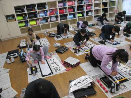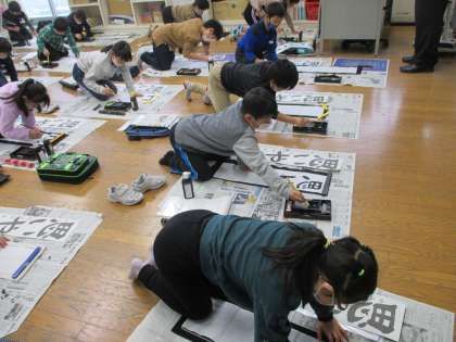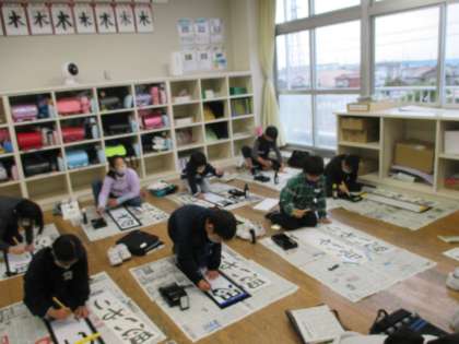 書写の時間に、初めて書き初めの練習を行いました。床で字を書くことや、大きな紙に書くことなど初めてのことばかりでしたが、子供たちは、意欲的に取り組みました。