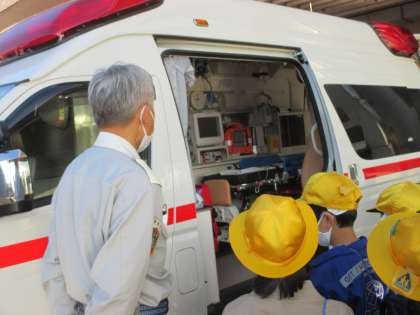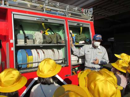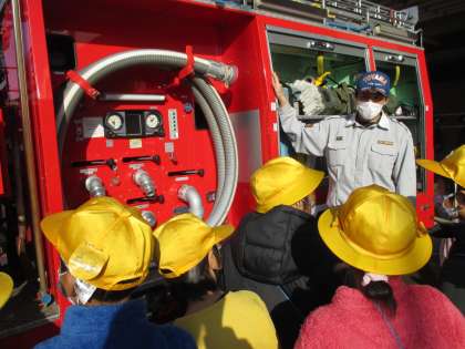 実際に使っているホースを触らせていただいたり、車両に乗せていただいて、大興奮の子どもたちでした。仕事を間近で見て、火事から命を守る大変さや大切を肌で感じている様子でした。