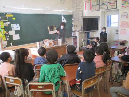 富山市立図書館岩瀬分館の司書2名に、ストーリーテリングや本の紹介をしていただきました。1組は「お家」、2組は「食べ物」をテーマに本を紹介していただき、子供たちは興味津々で聞いていました。終わったあと、借りた絵本を読むのが楽しみだと話をしていました。有意義な時間を、ありがとうございました。