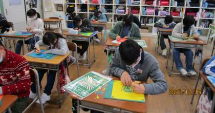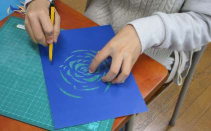 図画工作科では、カッターを使って作品を作りました。出来上がるまでは、どんな作品になるのかは分かりません。響き合うように形を切り取っています。