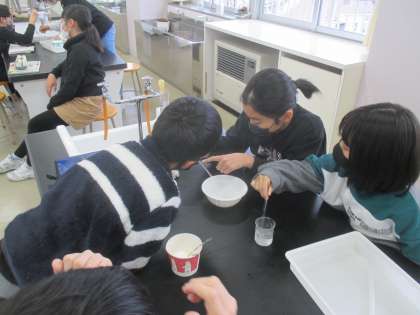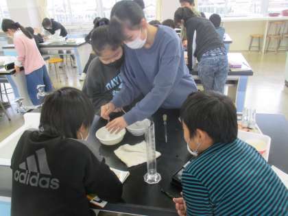 今日は、ビーカーの中に溶け残った食塩とミョウバンを溶かそうと、ビーカーの水の量を増やしたり、温度を変えたりして実験しました。ビーカーの中の水の温度を一定に保つのに苦戦しながらも、グループの友達と協力して、実験を終えることができました。一人一人が、結果から考えられることをしっかりとノートにまとめることができました。