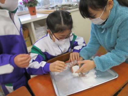 理科の学習の時間に、物の重さの学習をしています。今日は、塩と砂糖の体積を同じにして、重さ比べを行いました。実験前の予想では、「見た目がいっしょだから、重さもいっしょだよ」「つぶの大きさが違うから、塩が重いと思う」などと意見を交換していました。