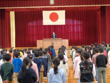第2学期終業式が体育館に全校児童が集まって行われました。久々に全校で集まる式だったのですが、落ち着いた雰囲気の中で進められていきました。校長先生からは、やろうと思ったことを続けることで本物の力になること、自分から取り組むことがとても大切であること等についてのお話があり、子供たちは真剣な表情で聞き入っていました。