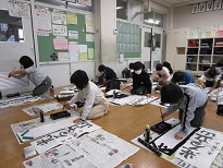 1月11日の始業式の日に、書初大会を行いました。冬休みに練習してきた成果を発揮するために、全員が集中して取り組んでいました。