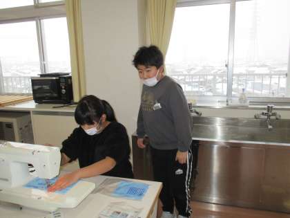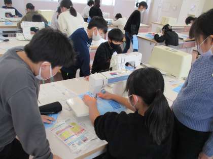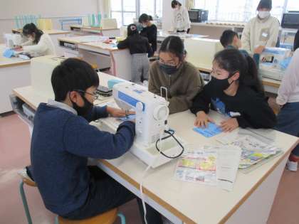 家庭科の時間に、ミシンでから縫いに挑戦しました。初めてミシンを扱う子供が多かったのですが、お互いに教え合って、上手にできていました。