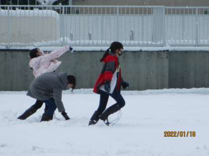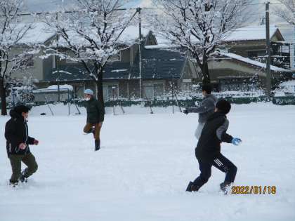 グラウンドに雪が積もった今日、なかよしタイムが始まると同時にグラウンドに飛び出してきたのは6年生男子でした。その後は、1年生、6年生女子、2年生。