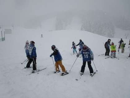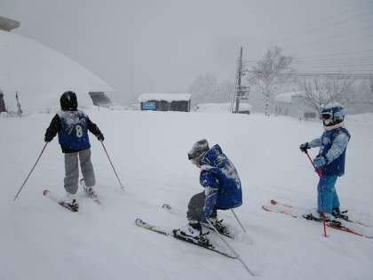 今日は、楽しみにしていたスキー学習です。みんながんばって練習していました。ゲレンデの下では、スキー板に慣れる練習をしていました。