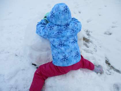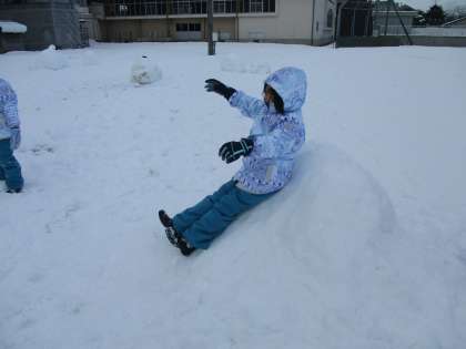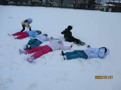 雪が積もったグラウンドで、寒さに負けず元気に遊んでいます。滑り台を作ったり、雪合戦をしたり、見ているだけで楽しくなってきます。