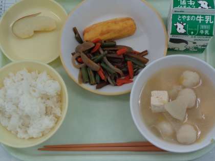 献立は、ごはん、牛乳、厚焼き卵、まかしときっきのきんぴらごぼう、ツネタのみそ汁、りんごです。