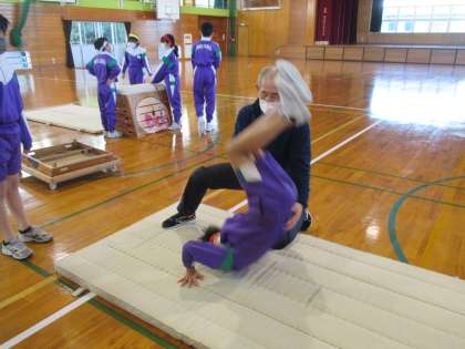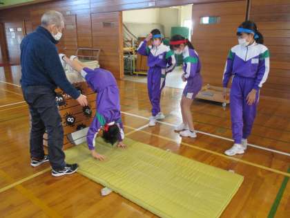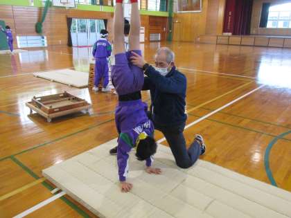 技7の金メダルを目指して、倒立前転の練習をしました。跳び箱を使ったり、補助をしてもらったりすることで、倒立から前転ができるようになってきました。