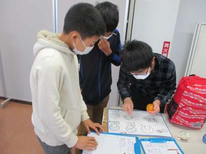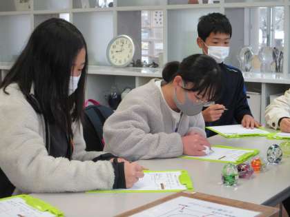 今日も6年生の子供たちが富山ガラス工房で卒業制作ペーパーウェイトづくりをしてきました。見本を見ながらどんな形にしようか、どんな模様にしようか、じっくりと考えていました。